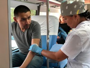 Қоғамдық денсаулық сақтау ұлттық орталығы ұйымдастырған көшпелі донорлық акция барысында Министрліктер үйінде орналасқан ұйымдардың 40-тан астам қызметкері, олардың ішінде 20-дан астам ҚДСҰО-ның қызметкерлері қан тапсырды.