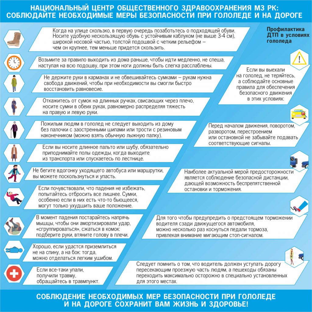 Национальный центр общественного здравоохранения МЗ РК: соблюдайте необходимые меры безопасности при гололеде и на дороге Когда на улице скользко, в первую очередь позаботьтесь о подходящей обуви. Носите удобную нескользящую обувь […]