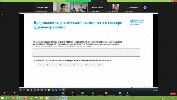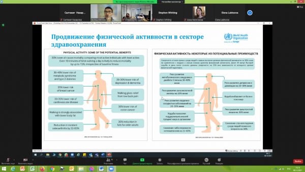 В ходе семинара Руководитель центра укрепления общественного здоровья Национального центра общественного здравоохранения МЗ РК Жанар Калмакова выступила с презентацией на тему «Обзор выбранных приоритетов на уровне страны», где рассказала о текущей ситуации в РК и предложила создать программы обучения включающие в себя курс занятий по общеукрепляющей физической активности для подготовки медицинских работников, включить физическую активность в университетские программы, разработать Национальные рекомендаций по физической активности для разных групп населения на основе рекомендаций ВОЗ и стратегии по профилактике малоподвижного образа жизни.