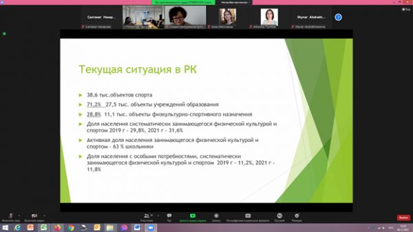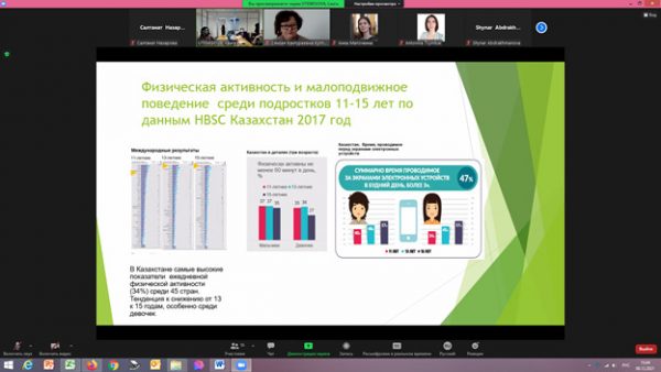 Кроме того, участвовали представители рабочей группы по физической активности Министерства здравоохранения РК, Национального центра общественного здравоохранения МЗ РК, Центра по физической активности в секторе образования Министерства культуры и спорта РК, Департамента организации медицинской помощи, Управления общественного здравоохранения и реабилитации, Медицинский университет Астана и др.