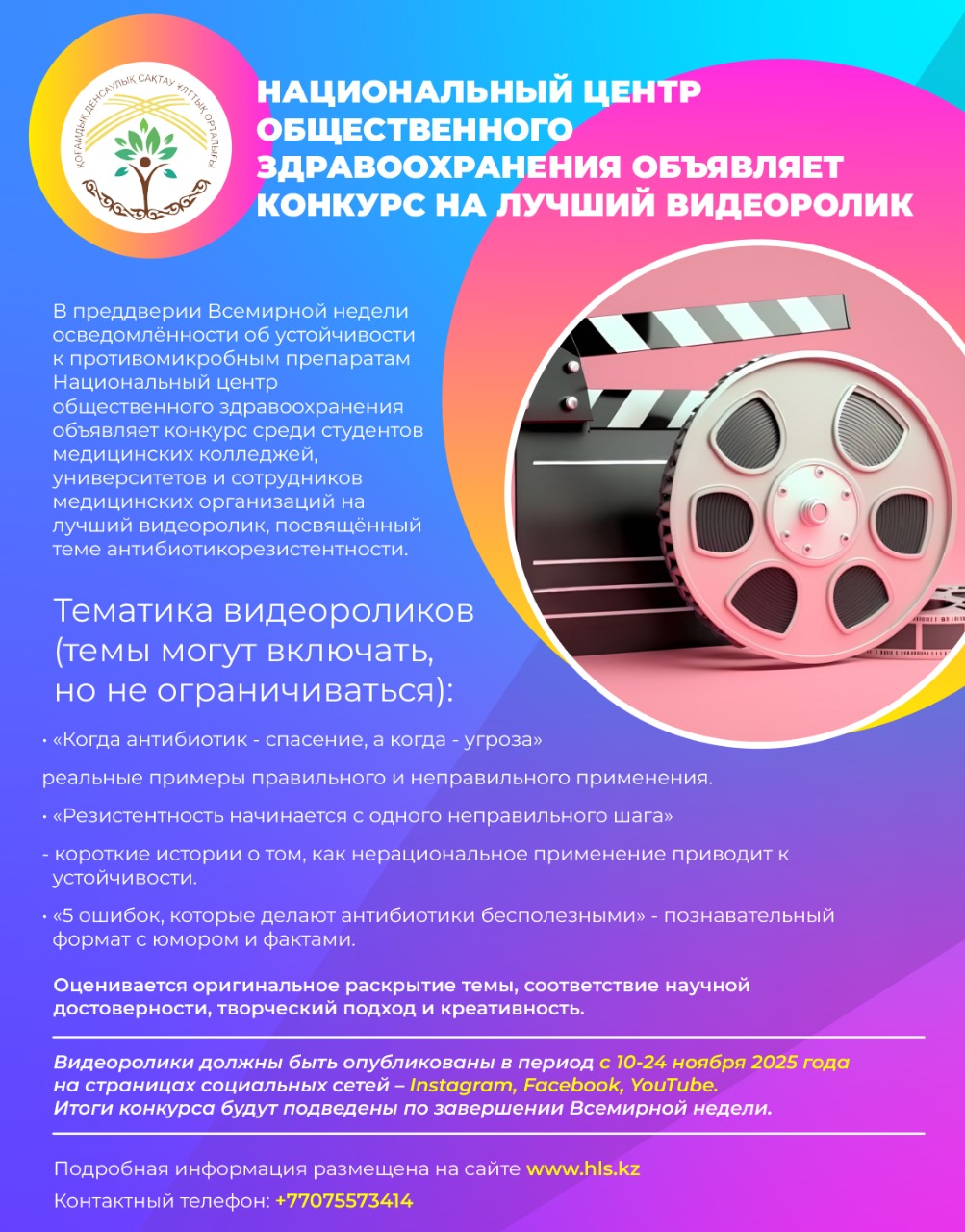 Национальный центр общественного здравоохранения в преддверии Всемирной недели осведомлённости об устойчивости к противомикробным препаратам объявляет конкурс среди студентов медицинских колледжей, университетов и сотрудников медицинских организаций на лучший видеоролик, посвящённый теме антибиотикорезистентности.