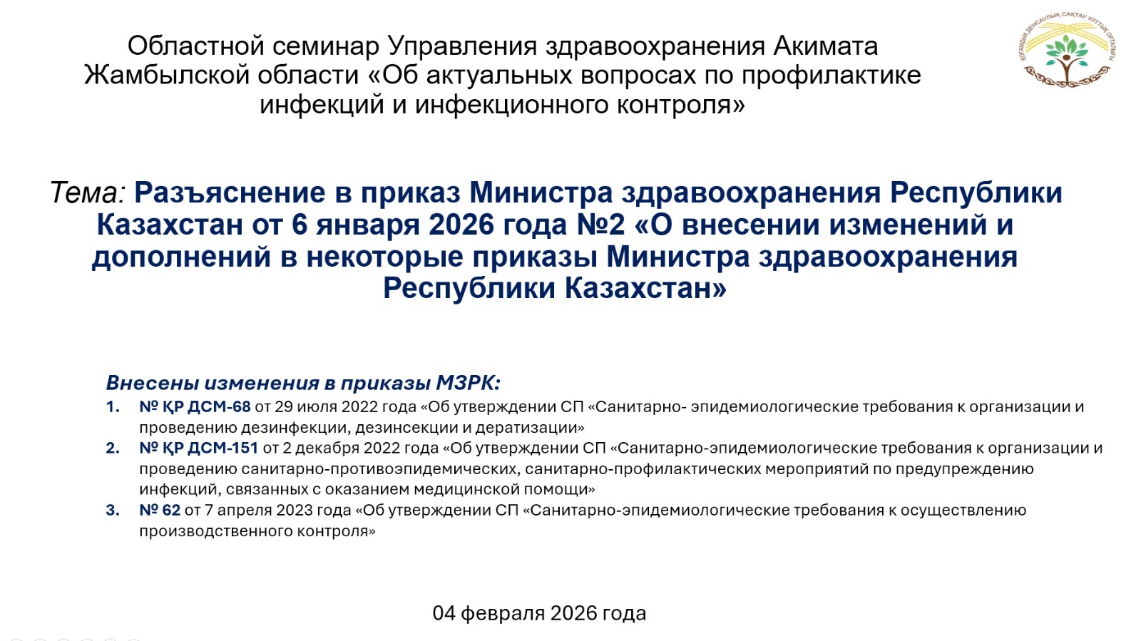 Лекторами выступили специалист руководитель отдела координации инфекционного контроля и антимикробной резистентности департамента профилактики инфекционных заболеваний НЦОЗ Гаухар Агажаева и главный эксперт КСЭК МЗ РК Динара Омарова. Лекторы дали разъяснения по приказу Министра здравоохранения Республики Казахстан от 6 января 2026 года № 2 «О внесении изменений и дополнений в некоторые приказы Министра здравоохранения Республики Казахстан». Особое внимание уделено новым подходам к совершенствованию практик стерилизации и дезинфекции, соблюдению гигиены рук в медицинских организациях, проведению производственного контроля, а также особенностям эпидемиологического надзора за инфекциями, связанными с оказанием медицинской помощи.